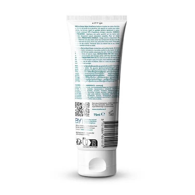 VistaFarma Hand Cream moisturizes and soothes hands. Enriched with shea butter and glycerin, it provides comfort to dry hands. Its light and pleasant formula quickly penetrates the skin.