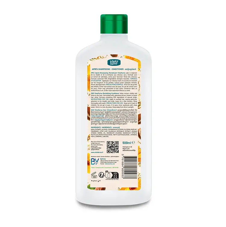 VistaFarma Revitalizing Conditioner helps restore vitality and shine to dry hair. Formulated with calendula extract, known to boost hair shine.