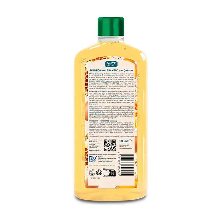 VistaFarma Revitalizing Shampoo effectively cleanses and helps restore vitality and shine to dry and damaged hair. Formulated with honey extract, known for its moisturizing action.