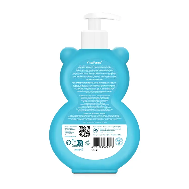 VistaFarma Top-To-Toe Wash gently cleanses baby’s body and hair. Thanks to its formula enriched with chamomille extract and D-panthenol, it takes care of baby’s skin and hair during bathing.